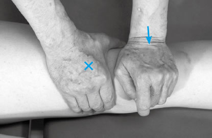 患者の肘関節を屈曲させる.そして筋収縮と弛緩を使って徐々に運動の最終位置へと動かす. |