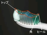 ③遠心隅角部は,ブラシのトップ(先端部)角を歯頸部に沿わせるように軽く当てます