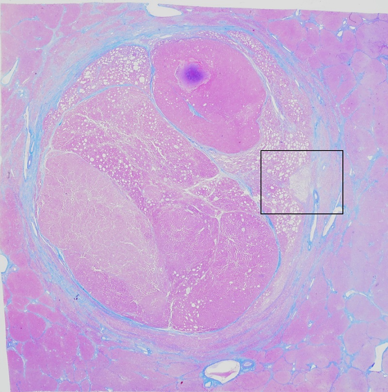 市 原:ありがとうございます.今回の病変は,比較的高エコー領域が目立つHCCです.ルーペ像も見てみましょう(図2).膠原線維の被膜に全周を覆われたHCCで,内部にはキラキラと白い部分があちこちに見られます.