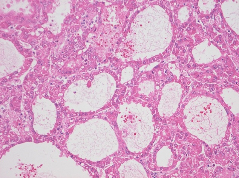 市 原:そうです.偽腺管パターン(pseudoglandular pattern)は,HCCにみられる細胞配列のバリエーションです.特殊な所見というわけではなく,HCCを顕微鏡で見ると,どこか一部にみられることが比較的多いです.ただ本例においては,病変のかなり多くの領域が偽腺腔を形成しています.これほど多いのは少し珍しいですかね.