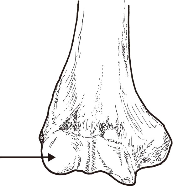 上腕骨遠位部の図を示す.矢印の部位はどれか.
