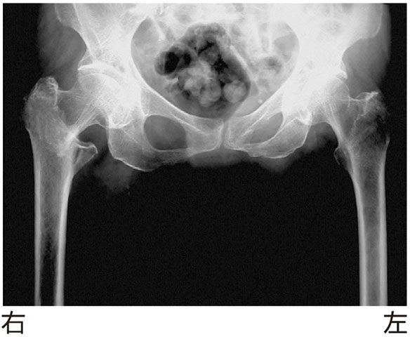 82歳の女性.転倒して右股関節痛を訴えた.エックス線写真を下に示す.疑うべき疾患はどれか.