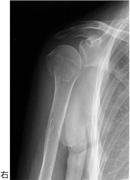 60歳の女性.転倒して右肩関節痛を訴えた.エックス線写真を下に示す.まず患部に