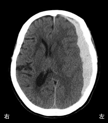 次の文により21・22の問いに答えよ.66歳の女性.右利き.階段から転落.転落直後は意識消失していたが,数分後に意識回復.しばらくの間,意識は清明であったが,1時間後に手足の麻痺が出現し,再び意識が低下して昏睡になった.救急搬送時の頭部CTを下に示す.