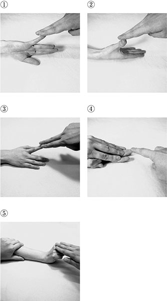 検査の写真を下に示す.ASIAにおけるT1のkey muscleの検査はどれか.