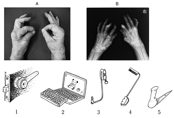 68歳の女性.関節リウマチ.右利き.夫との2人暮らし.肩関節と肘関節に可動域制限はない.膝関節痛の鎮痛のために坐薬を用いている.手関節痛が強いときには夫が家事を行っているが,できるだけ自分でやりたいという気持ちが強い.手指の写真(A)とエックス線写真(B)とを右に示す.この患者に対する自助具で