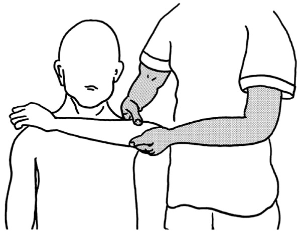 30歳の男性.頸髄損傷完全麻痺(第6頸髄まで機能残存).上腕三頭筋の筋力検査を行う場面を図に示す.代償運動が出現しないように作業療法士が最も